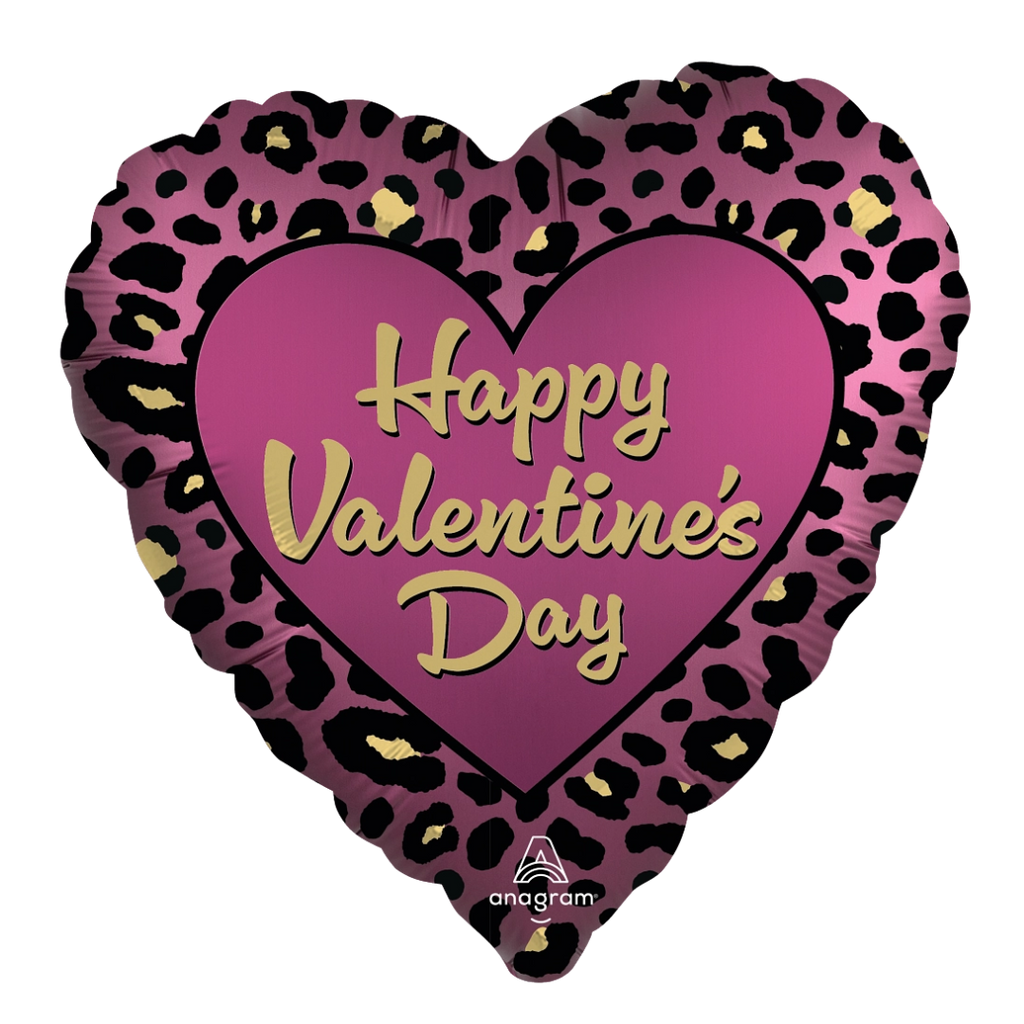 The 18 inch Valentine balloon is a heart shape featuring a high-quality finish. The balloon reads "Happy Valentine's Day in a retro script surrounded by an exotic leopard print. Perfect for your event of showing some love!