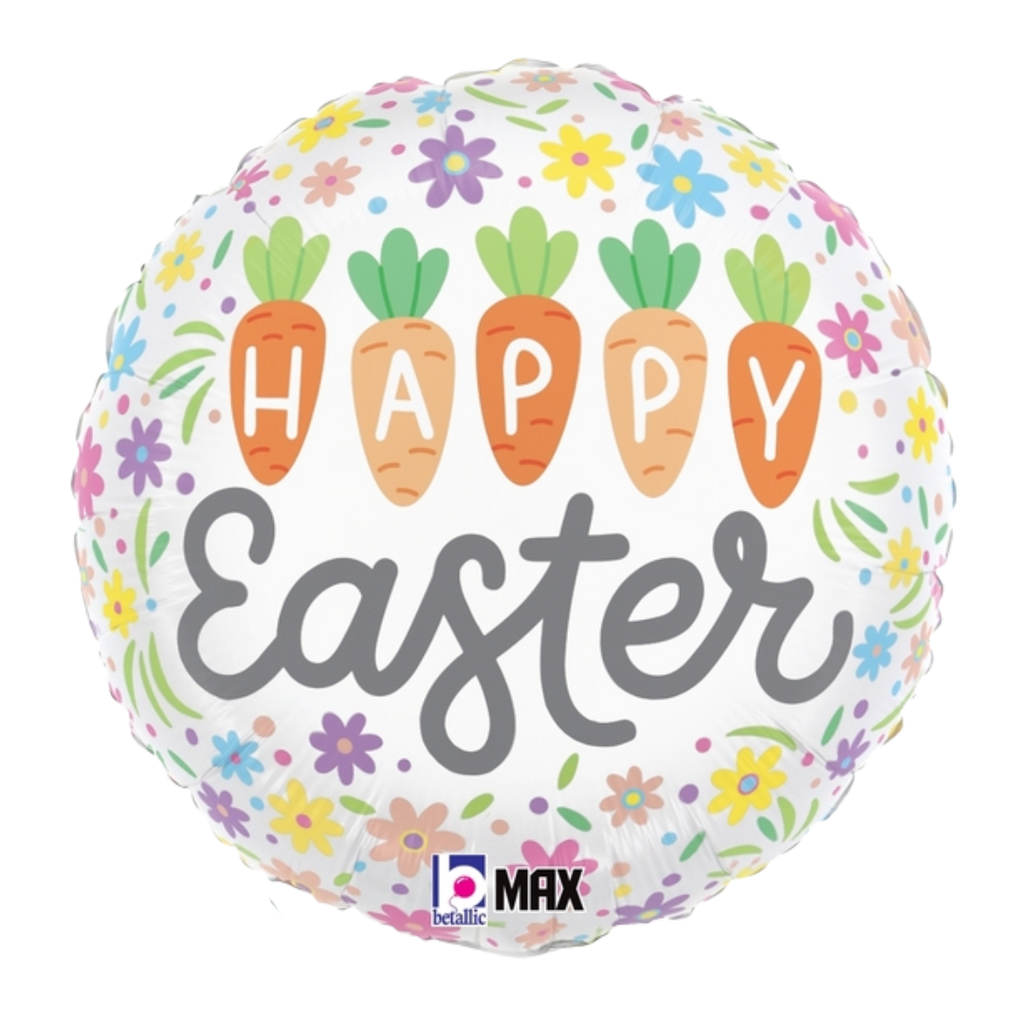 The 18" Happy Easter Carrots foil balloon is perfect for any Easter display or gift! This white, round balloon features multi-colored flowers and carrots surrounding the phrase "Happy Easter". Use with air or helium.