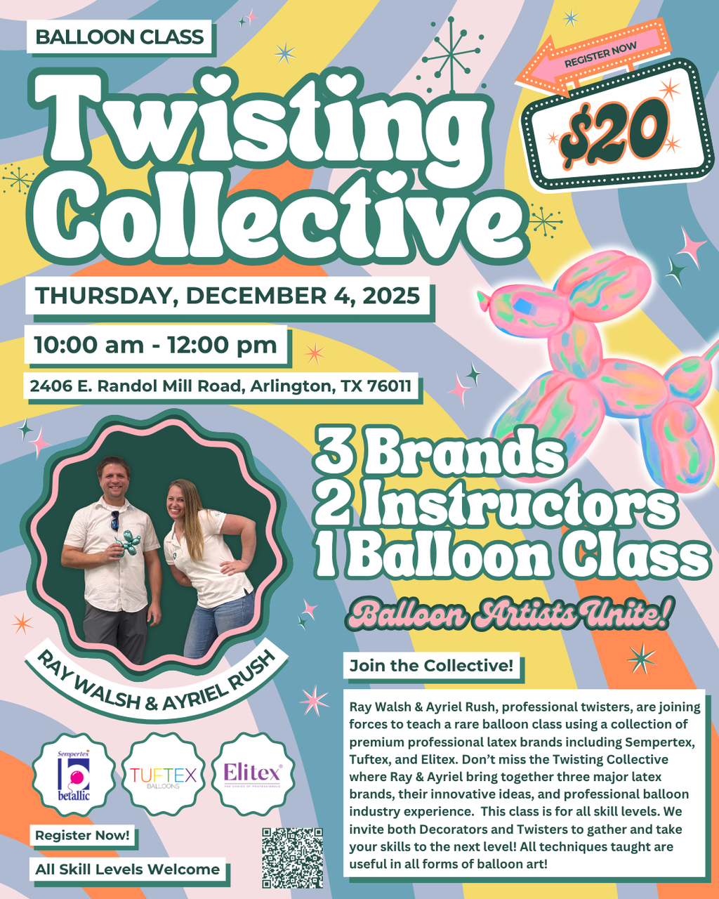 Ray Walsh & Ayriel Rush, professional twisters, are joining forces to teach a rare balloon class using a collection of premium professional latex brands including Sempertex, Tuftex, and Elitex. Don’t miss the Twisting Collective where Ray & Aryiel bring together three major latex brands, their innovative ideas, and professional balloon industry experience. This class is for all skill levels. We invite both Decorators and Twisters to gather and take your skills to the next level! All techniques taught are useful in all forms of balloon art! Both, Ray and Ayriel have taught multiple class at All American Balloons. Each has years of twisting and decorating experience which makes them very knowledgeable on the balloon industry. You don't want to miss this class!
